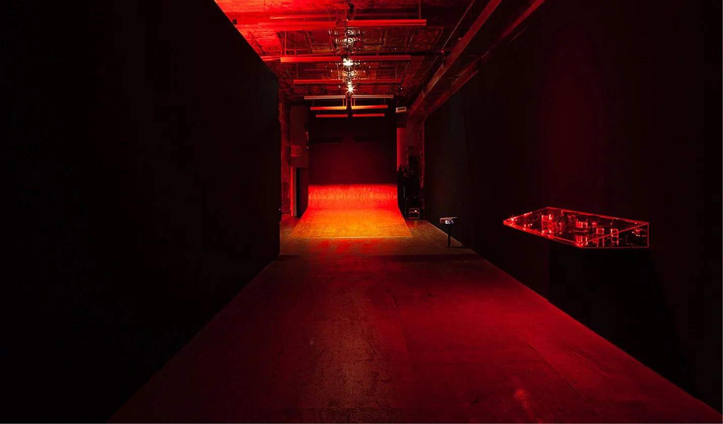 Image description: In the dark, a modular structure set in the floor hosts open water that shows several distinct ripple patterns in motion on its surface.